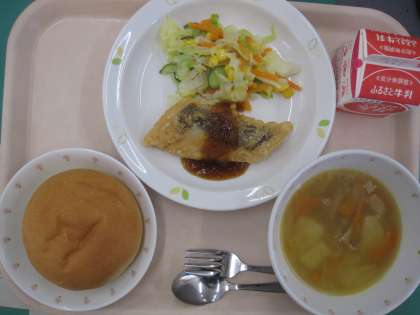 まるパン 牛乳 魚のバーベキューソースがけ キャベツサラダ 白いんげん豆のスープ
