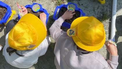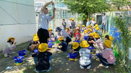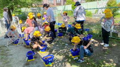 鉢に土を入れて、アサガオの種を植えました。子どもたちは、種を一粒一粒丁寧に植えていました。