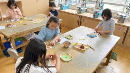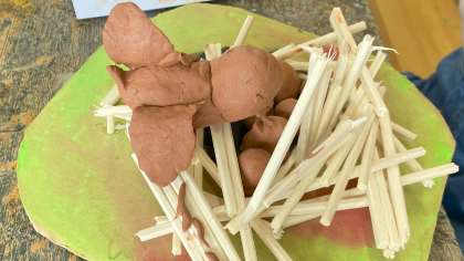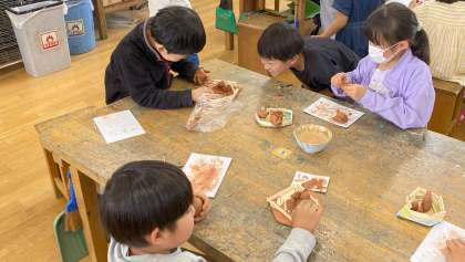 「トリの巣」を割りばしで作りました。次に、指先を使って粘土をひねり出して鳥の形を作っていきました。どんなトリ?何しているところ?などをイメージしながら表現していきました。