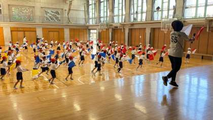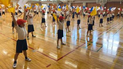 運動会に向けての学習が始まりました。2年生は両手に小旗をもって演技します。一つ一つの動きについて、体を動かしながら覚えていきました。速いテンポの曲によくついていきました。