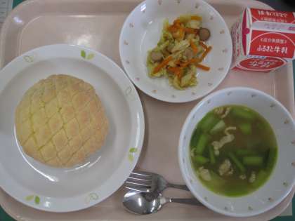 手作りメロンパン 牛乳 キャベツとウィンナーのソテー ABCスープ