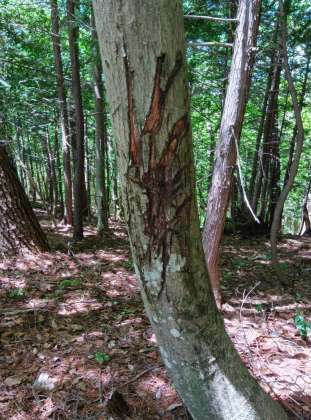 クマの爪跡が残る木です。山深い場所です。 ハイキングの入口で、爆竹を鳴らしてから入りました。