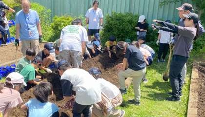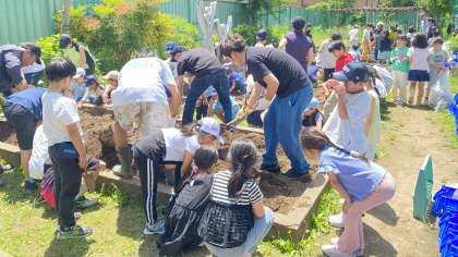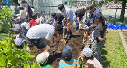 2年生は、トマト、トウモロコシ、なす、ピーマン、オクラなど畑に野菜の種を植えて育てていきます。まず始めに土づくりをします。おやじの会の皆様にお手伝いいただきながら、畝をつくりました。