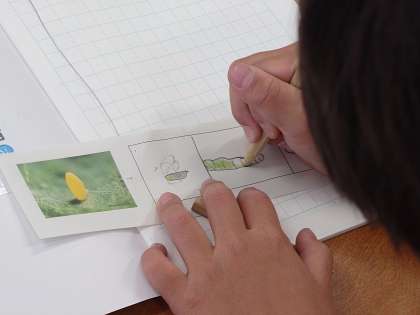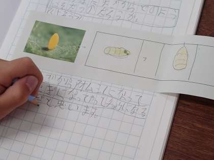 モンシロチョウの小さなたまごを見たこども達は、どのようにモンシロチョウへと成長するのか不思議に思い、一人一人が予想しました。(5月14日)