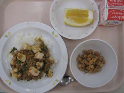 麻婆豆腐丼 牛乳 大豆とじゃこの甘辛揚げ くだもの(美生柑)