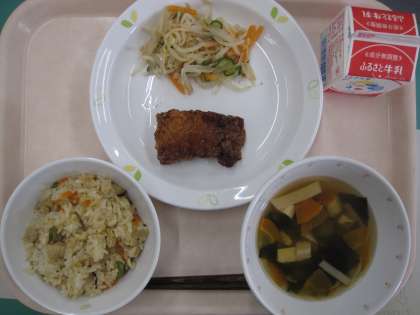 とりおこわ 牛乳 いかのかりんと揚げ もやしの梅じょうゆ和え 若竹汁
