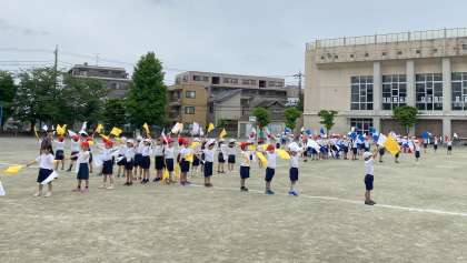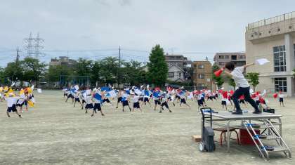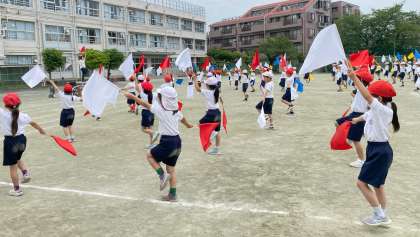 運動会に向けて、表現「The Tamazutsumy Show」の練習をしています。音楽のリズムに合わせて、ステップを踏みながら、旗を操作して表現します。動きに切れが出てきました。隊形移動もすばやくできるようになりました。