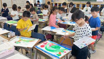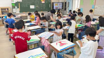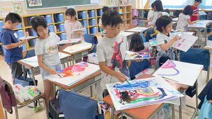 「えのぐじま はっけん!」の学習に取り組んでいます。形、色、筆の使い方を工夫して、画用紙いっぱいに、伸び伸び表現しました。