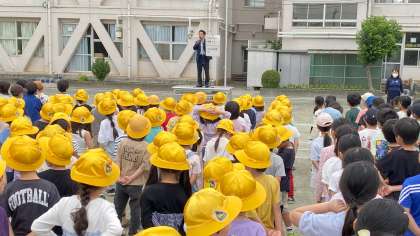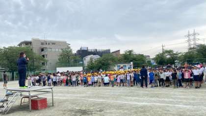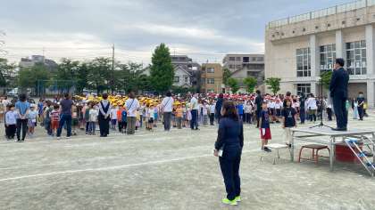 校長は、今週行われる運動会に向けて、子どもたちへメッセージを送りました。次に、「〇〇がない世界って どんな世界?」について、〇〇に入る言葉を考えて、想像するように、子どもたちに呼びかけました。『問い』をもつことの大切さについてお話しました。看護当番の教員は、今週の目標「こまめな水分補給を心掛け、元気よく過ごそう」についてお話しました。