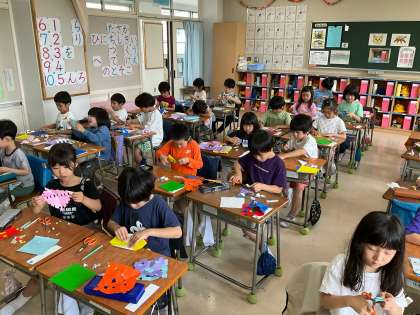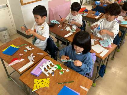 チョッキンパでかざろうでは,折り紙を工夫して折り,模様を描いて切ることで,様々な形の折り紙を作りました。5枚の折り紙を繋ぎ合わせて,作品を完成させました。たくさん試して様々な形ができていくのを楽しんでいました。