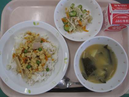 親子丼 牛乳 はりはり酢の物 じゃがいものみそ汁