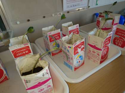 ヘチマを土に植えて観察しています。すべての子葉が校庭に向いています。(5月30日)