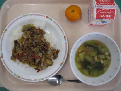 ホイコーロー丼 牛乳 中華風スープ 冷凍みかん