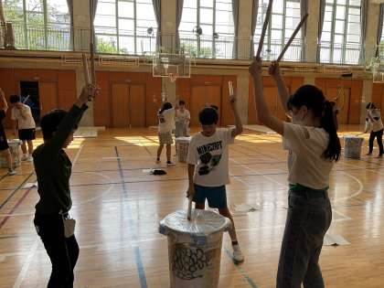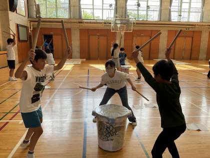 一つの太鼓に対し、複数人でリズムを刻みます。移動と演奏を同時に行うのは難しいですが、楽しく練習できました。