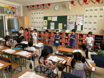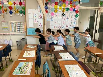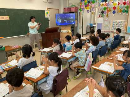 「はくにのってリズムをうとう」の学習をしています。一列に並んでリズムに合わせて動いたり,拍に合わせて手を叩いたりしました。カスタネットを正しくもって,演奏することもできました。
