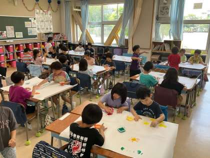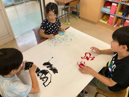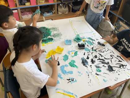 「さわってまぜてきもちいい」の学習では,絵の具と洗濯糊を混ぜたとろとろ絵の具を使って,指や手で絵を描きました。とろとろした感触を楽しみながら,それぞれの思い描くものを描きました。