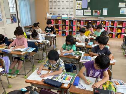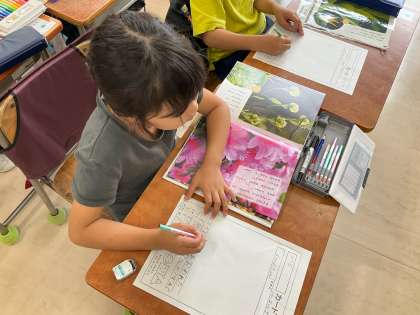 「つぼみ」の学習をしています。教科書では,「あさがお」「はす」「ききょう」のつぼみについて学習をしました。今回は,まとめの学習として,初めて調べ学習をしました。つぼみや花,葉っぱや茎など,様々な自然の本から一冊選び,ワークシートに文字と絵で丁寧に仕上げました。