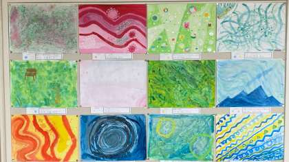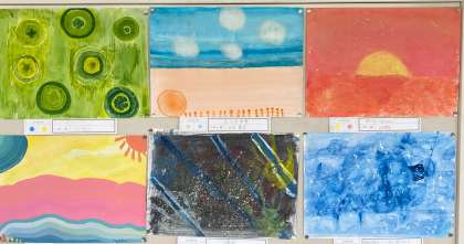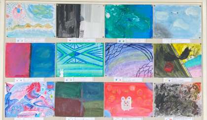 「はじまりは2色」好きな2色を選んで、画用紙に色をつけました。色や水の量で、色合いが変わることを感じながら表し、イメージを広げていきました。最後には夢や心など、テーマを決めて仕上げました。