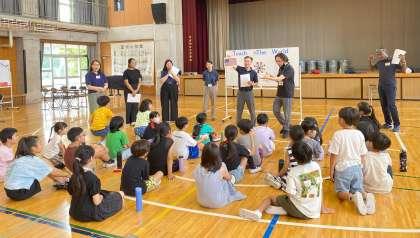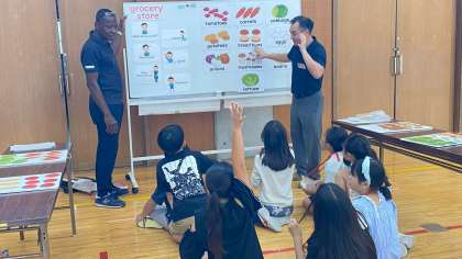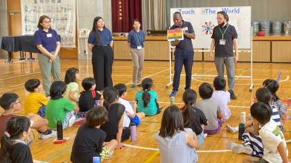 世田谷区内の他校で勤務しているALTが6名来校し、『Touch The World』英語体験授業を実施しました。ALTの出身地あてクイズから授業がスタートしました。