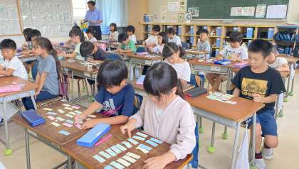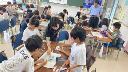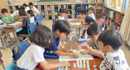 「まちをたんけん 大はっけん」の学習を進めています。野毛町公園に行って、見つけたことを一人一人が付箋に書き出しました。グループごとに発見したことを伝え合いながら付箋を公園の地図に貼っていきました。