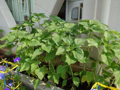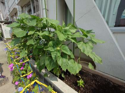 ヒマワリがのびてきたので支柱をつけました。(7月6日)