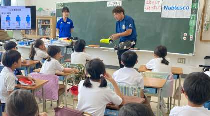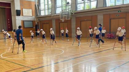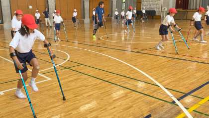 始めに教室で障がい者サッカーやお招きした選手の障がいと日常生活についてお話をしていただきました。「工夫をして一緒に楽しむ」という言葉が印象的でした。後半は体育館でクラッチ(つえ)を使用して歩いたり、ボールを蹴ったりして、アンプティサッカーの体験をしました。