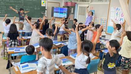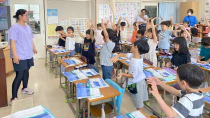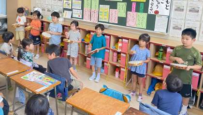 「はくに のって リズムを うとう」の学習をしています。タンブリンを打ち、3拍子の感じをつかんでいきました。「海」の歌を曲想と歌詞から情景を想像して、全身で表現しながら歌いました。