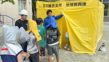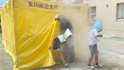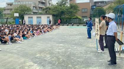 7月避難訓練の想定は『職員室より出火』です。玉川地域振興課の方から火災の時の避難の仕方について教わりました。3年生、5年生は、煙中体験も実施しました。低い姿勢になり壁伝いで出口にたどり着く方法を体験的に学びました。