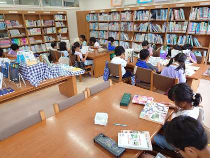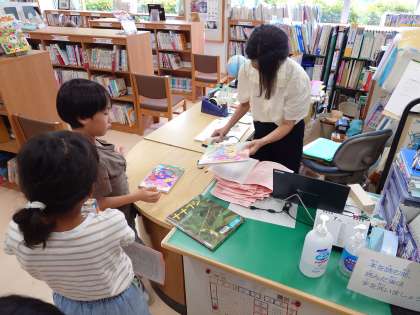 今日の図書の時間は、夏休み中借りられる本を3冊選びました。みんな、何を読もうか悩んでいました。(7月11日)