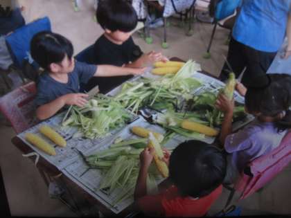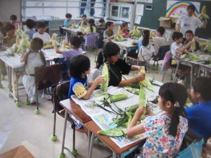 生活科の時間に、とうもろこしの皮むき体験をしました。