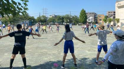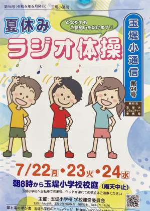 玉堤小学校学校運営員会主催のラジオ体操を7月22日より、3日間実施しています。前に出て全体をリードするのは、本校の卒業生、尾山台中学校の生徒さんです。