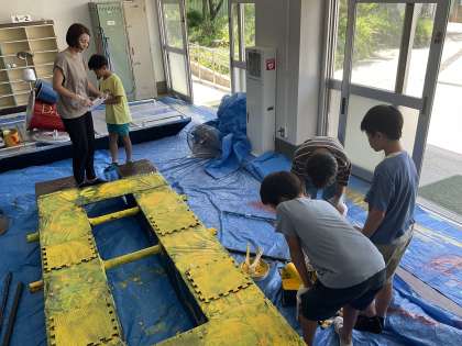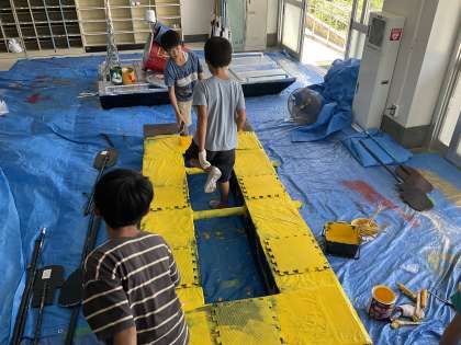 ペンキの缶を開けるのも大冒険!みんなで力を合わせて頑張っています。