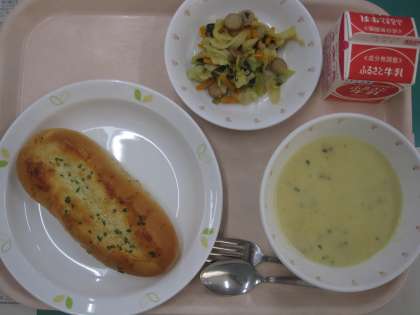 ガーリックフランス 牛乳 ウィンナーとキャベツのソテー コーンポタージュ