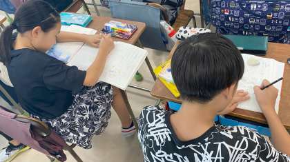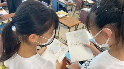 物語文「やまなし」の学習を進めています。『12月』の場面を読み、イメージを膨らませて、絵で表現しました。出来上がった絵を友達と紹介し合い、さらに読みを深めていきました。