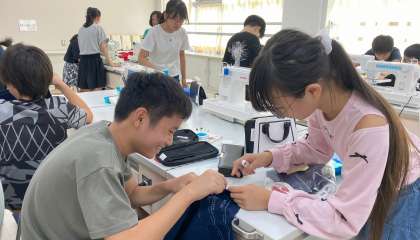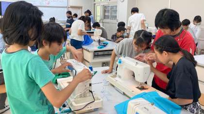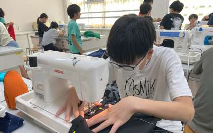 エプロンを作成しています。今日の目標は、「ミシンでエプロンの脇2本を縫う」です。友達と協力して、作業を進めていました。
