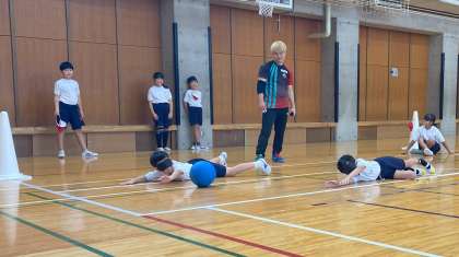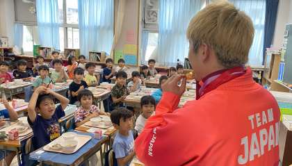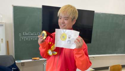 授業の最後には、チームで対戦し、ゴールボールの難しさや楽しさを実感していました。佐野選手からは、全校の子どもたちとも交流したいとのお話をいただき、金メダルをもって給食の時間に全学年の各教室を回ってくださいました。子どもたちから、佐野選手へは、金メダルの絵やメダルのプレゼントがあり、微笑ましい交流場面を見ることができました。