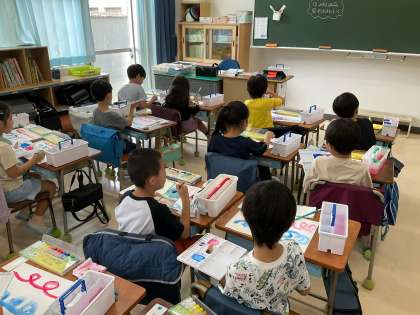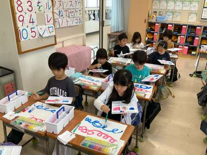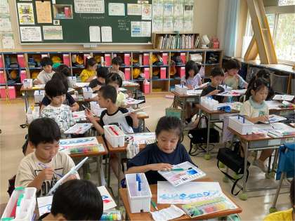図工「絵の具の練習」では,絵の具セットの使い方を学習しました。初めて絵の具セットを触るため,使い方を確認しながら,絵の具で線を描きました。バケツに水を入れて運んだり,パレットを片手で持ったり,慣れないことがたくさんありましたが,楽しみながら学習に取り組みました。