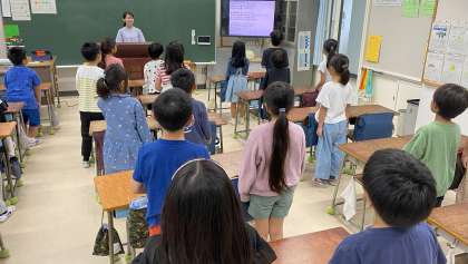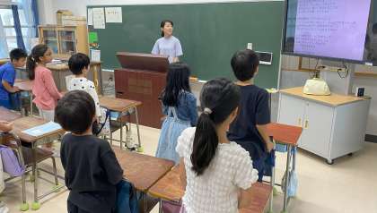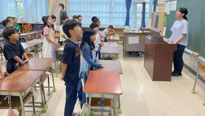 学芸会の劇の最後に歌う「みんなの学校」の歌を歌詞を覚えながら練習しました。教室に美しい歌声が響いていました。