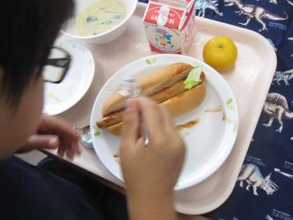 今日の給食ではコッペパンにウィンナーとキャベツを自分で挟み、