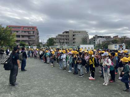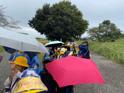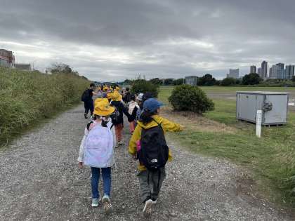 1,2年生合同で多摩川台公園へ遠足に行きました。出発式をし,わくわく班ごとに河川敷を歩きました。途中で雨が少し降り,雨具を着用して,公園へ向かいました。