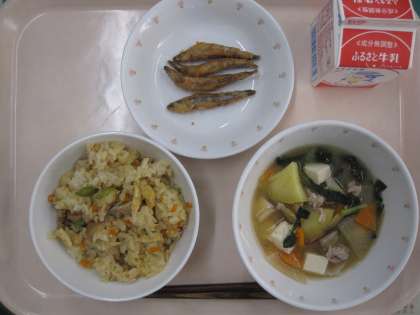 五目ごはん 牛乳 きびなごのから揚げ さつま汁