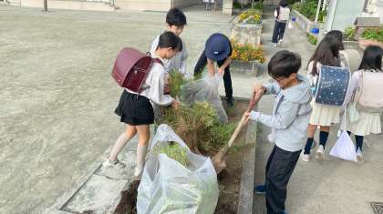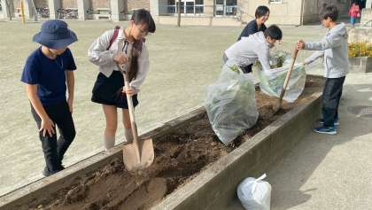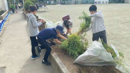 環境美化委員の児童が花壇の整備をしています。これからの季節のこの場所は、野菜を育てる畑になります。玉ねぎを植えて育てていくそうです。