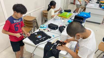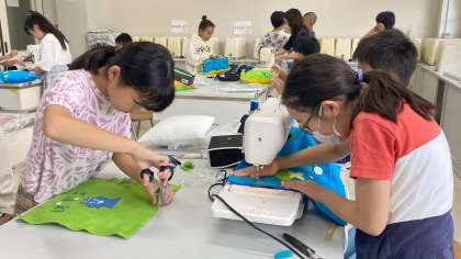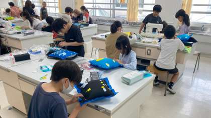 『フェルトクッション』製作の仕上げをしています。個性あふれるデザインで飾りつけをしたり、まわりをミシンで縫ったりしました。