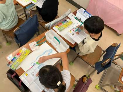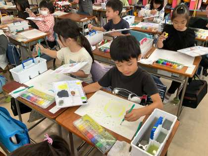 「すいすいぐるーり」の学習をしました。筆と絵の具で紙の上をお散歩させながらのびのびと作品を仕上げました。自分の好きな色を使って,「すいすい」や「ぐねぐね」や「ちょんちょん」など,いろんなお散歩の仕方で楽しみました。