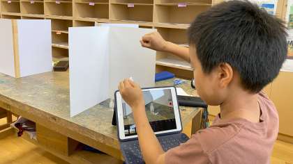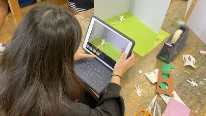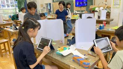 ストップモーションアプリを活用して、写真を連続再生して表現します。イメージを膨らませながら写真を撮っては再生し、確認しながらつくっていきました。子どもたちは、作品づくりに夢中です!
