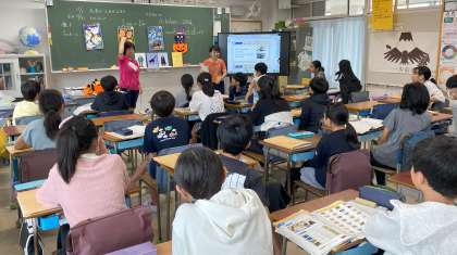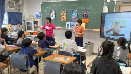 英語支援員と外国語担当の教員が協力して授業を進めています。季節に合わせて、ハロウィーン・キャラクターの名前の表記をゲームを通して覚えていきました。授業は盛り上がっていて、楽しい雰囲気でした。