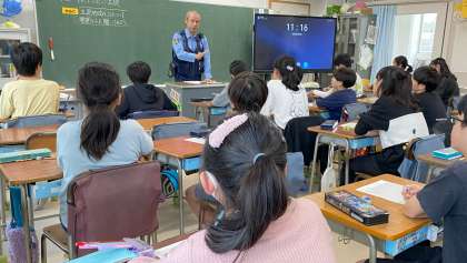 「帰ってきたい玉堤」についての学習を進めています。子どもたちは、玉堤地域の安全を守るために、どのなことを行っているのか、調べたてきました。今日は、警察の方にお話をしていただき、さらに追求していきました。