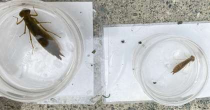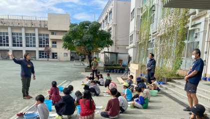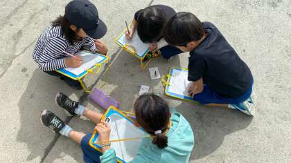 ビオトープの学習を進めています。今日は、講師の先生をお招きしての授業です。たくさんのアドバイスをいただきながら、ビオトープに生息する生き物を捕獲し、観察しました。 子どもたちは、生き物をバケツから小さな容器に移し、じっくり観察して、分かったことを文章と絵で表現しました。写真の生き物は、ギンヤンマとクロスジギンヤンマのヤゴです。