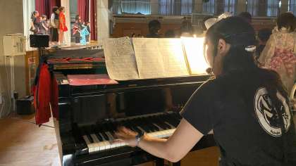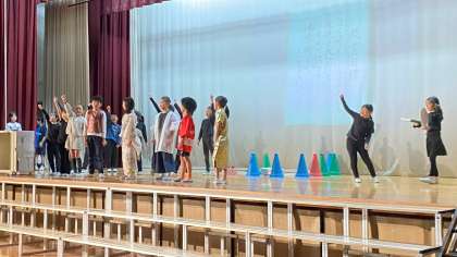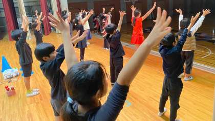 『どろぼう学校』の劇の練習をしています。全員の美しい歌声も広がります。音楽専科の教員が、すべての学年のサポートをしています。