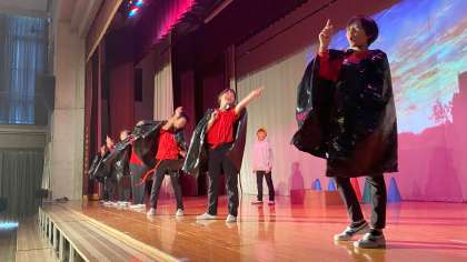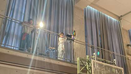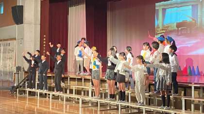 『新・魔王の谷に歌が聞こえる』の劇の練習をしています。舞台照明やスポットライトも子どもたちがローテーションをして担当しています。劇を観ている人をイメージして、舞台の効果を高めています。
